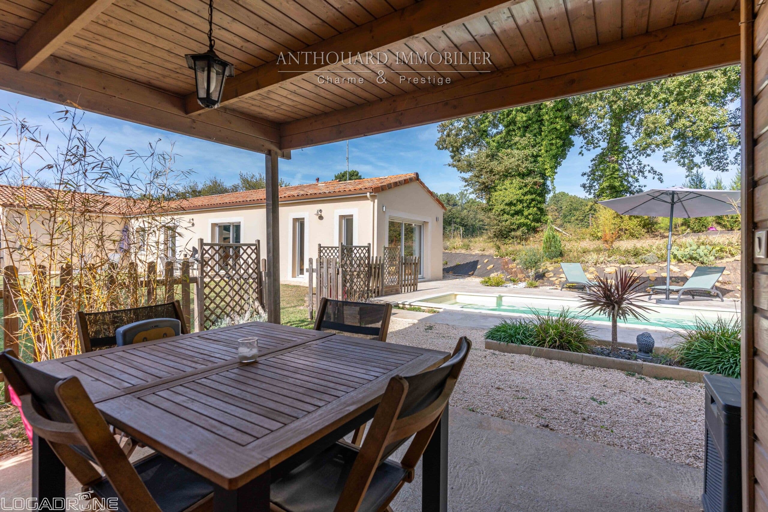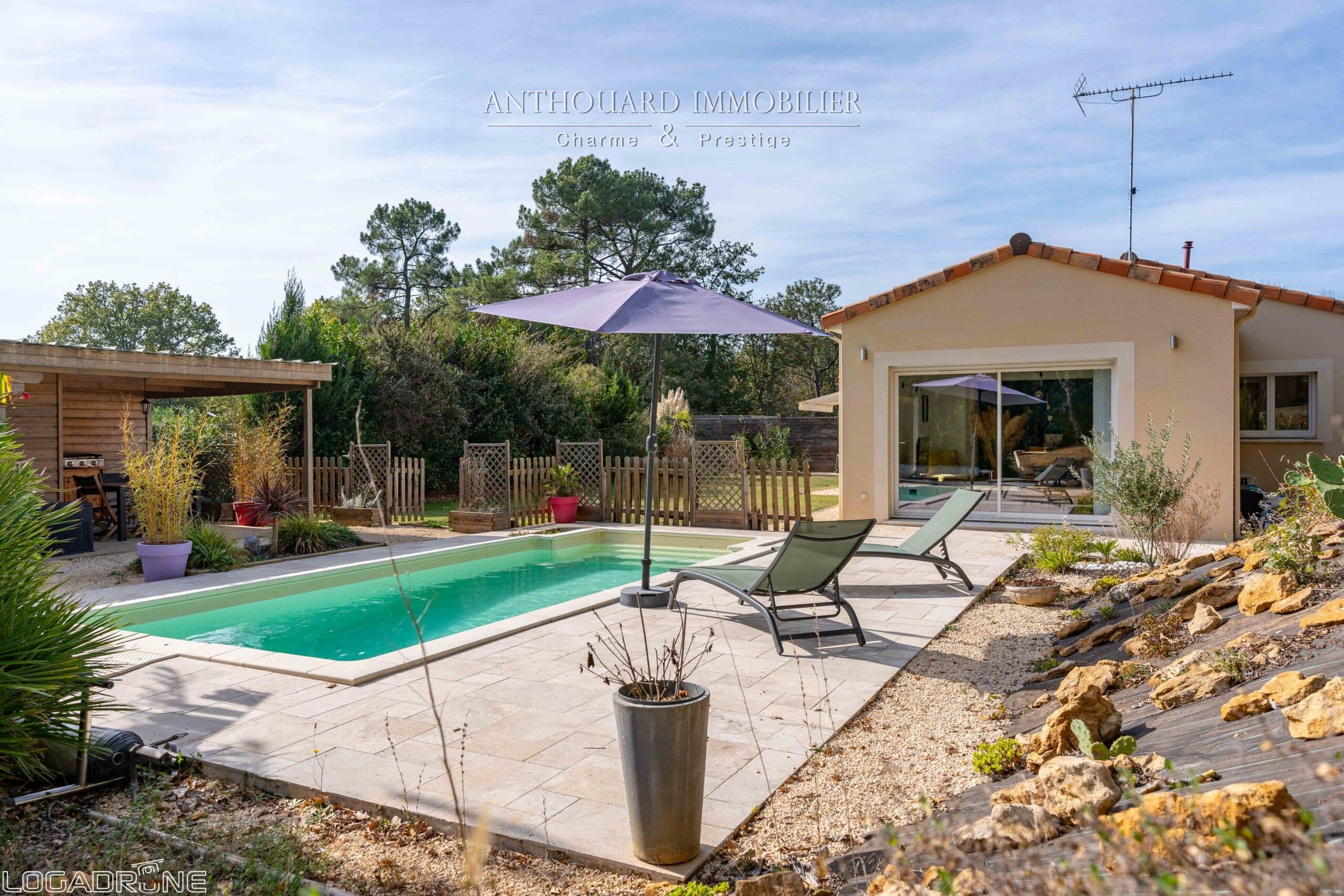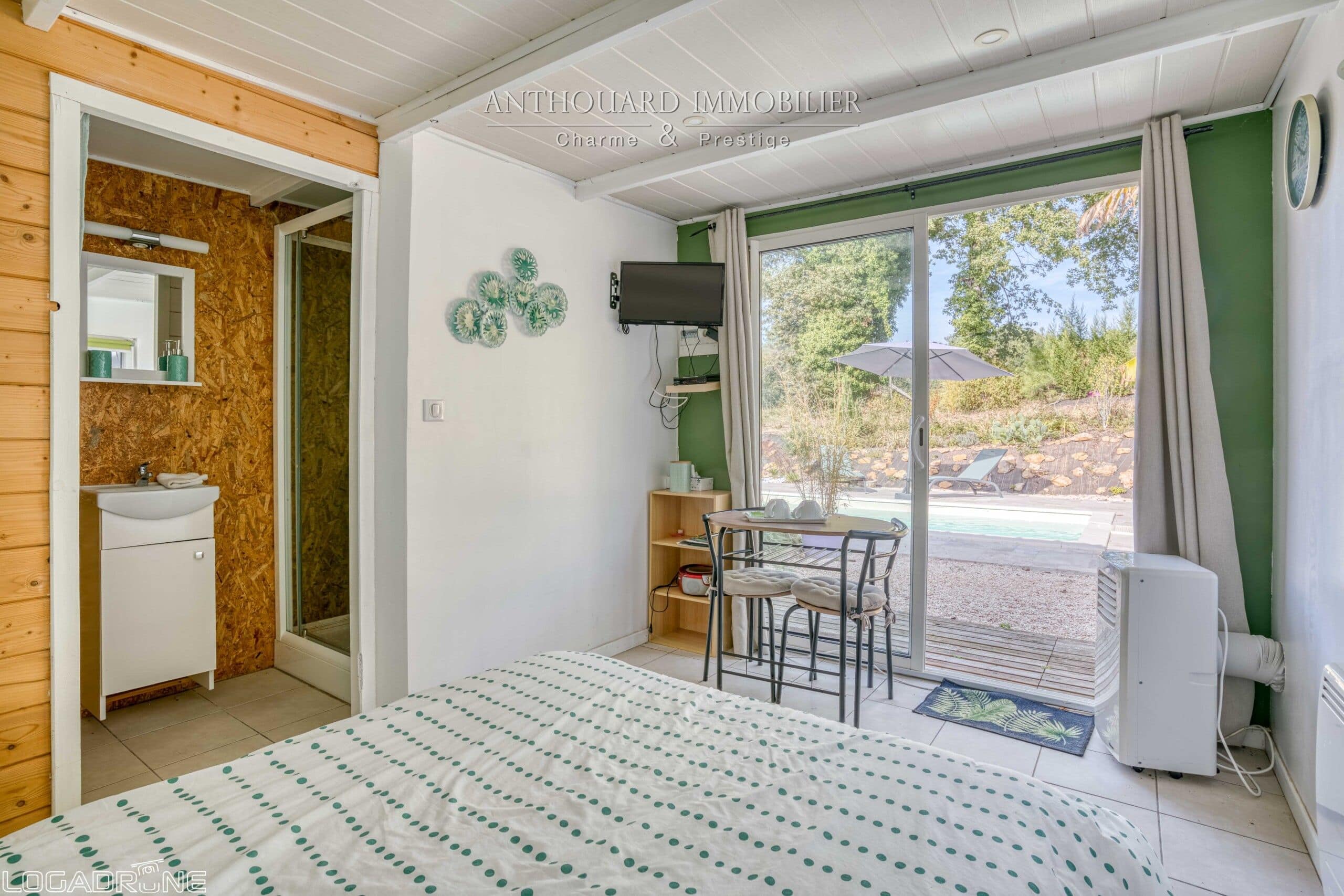 Autour de la piscine se trouve un pool house avec terrasse couverte. Une chambre d’hôtes indépendante avec salle d’eau, wc et espace jacuzzi.