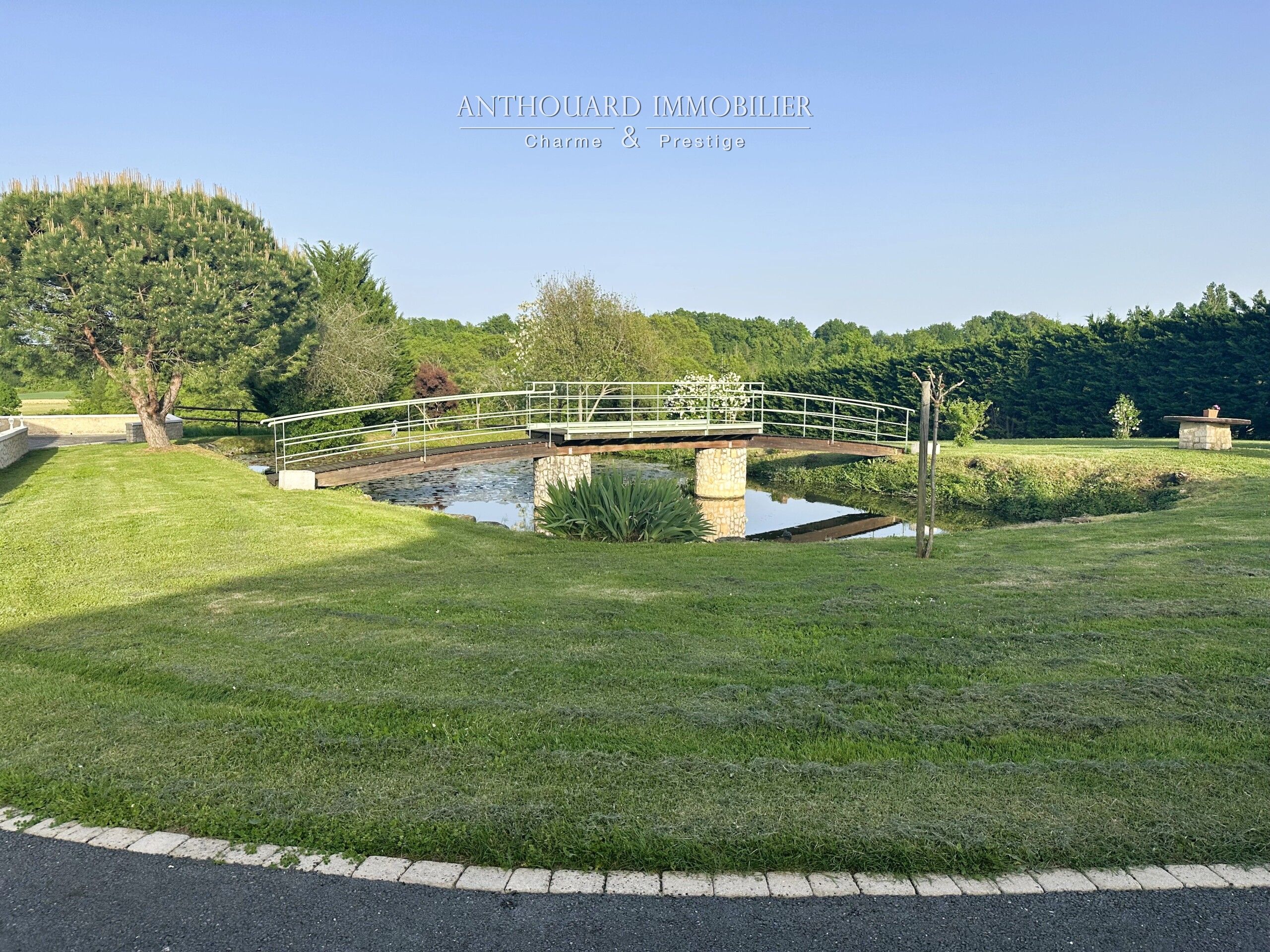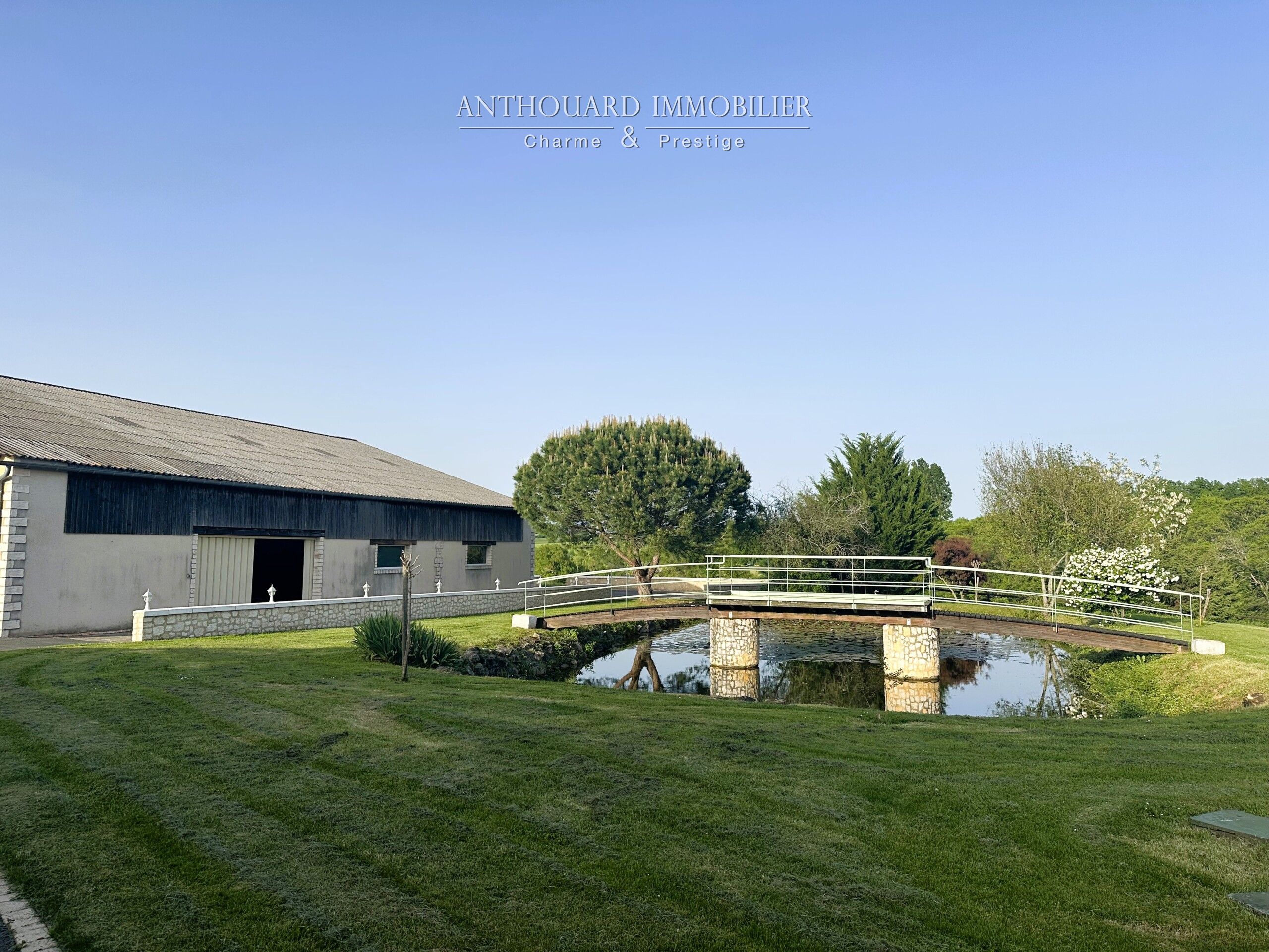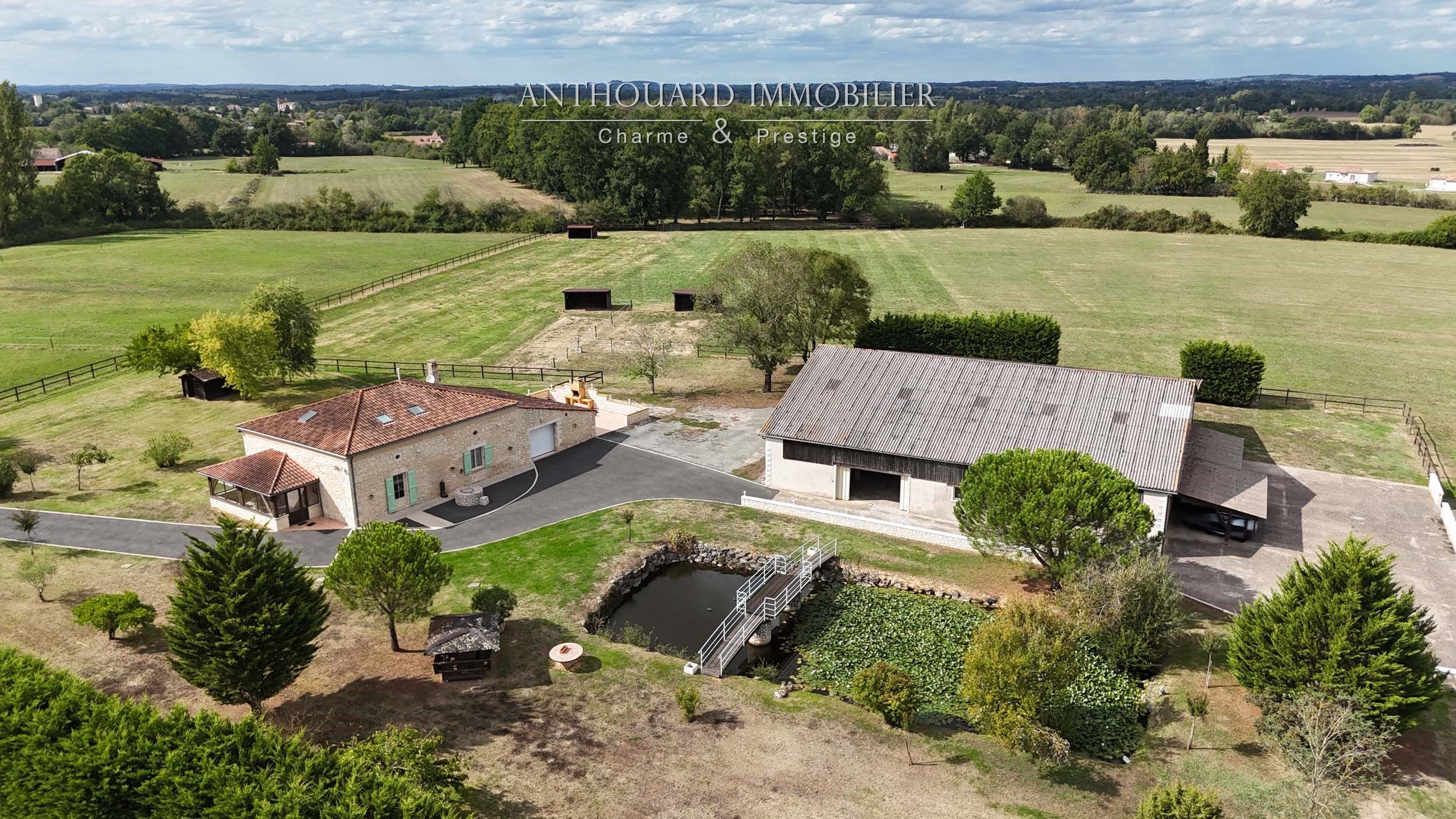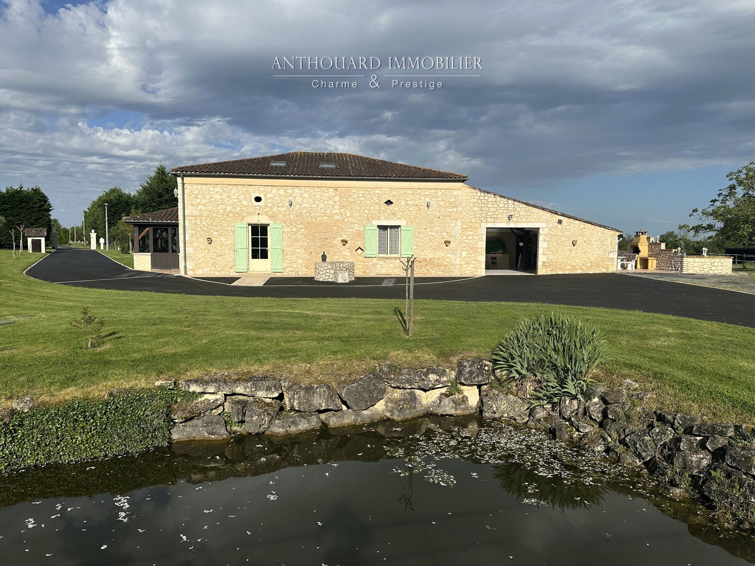 A landscaped pond of approx. 350 m², entrance to the property via an automatic gate, asphalt access and parking area.