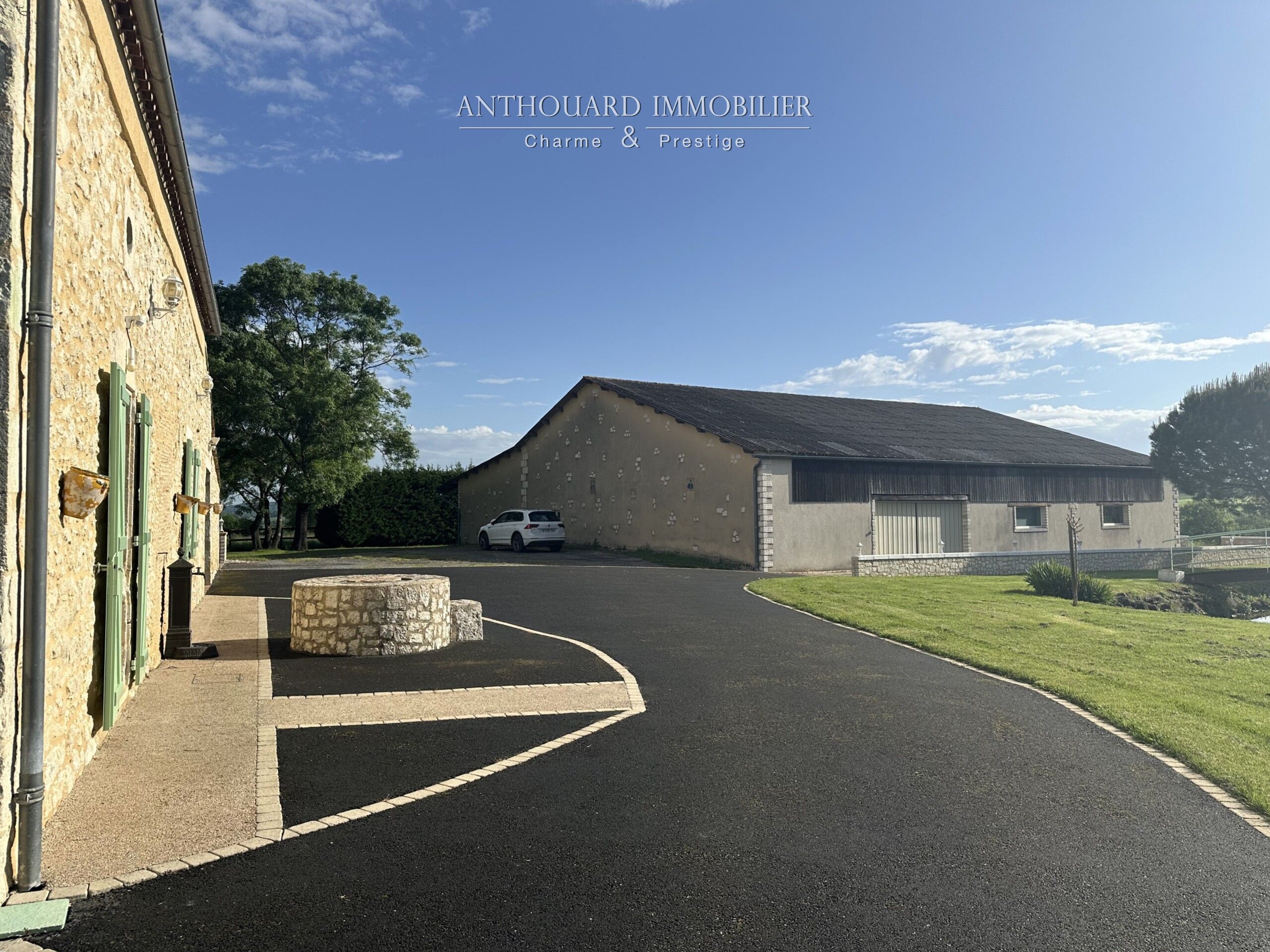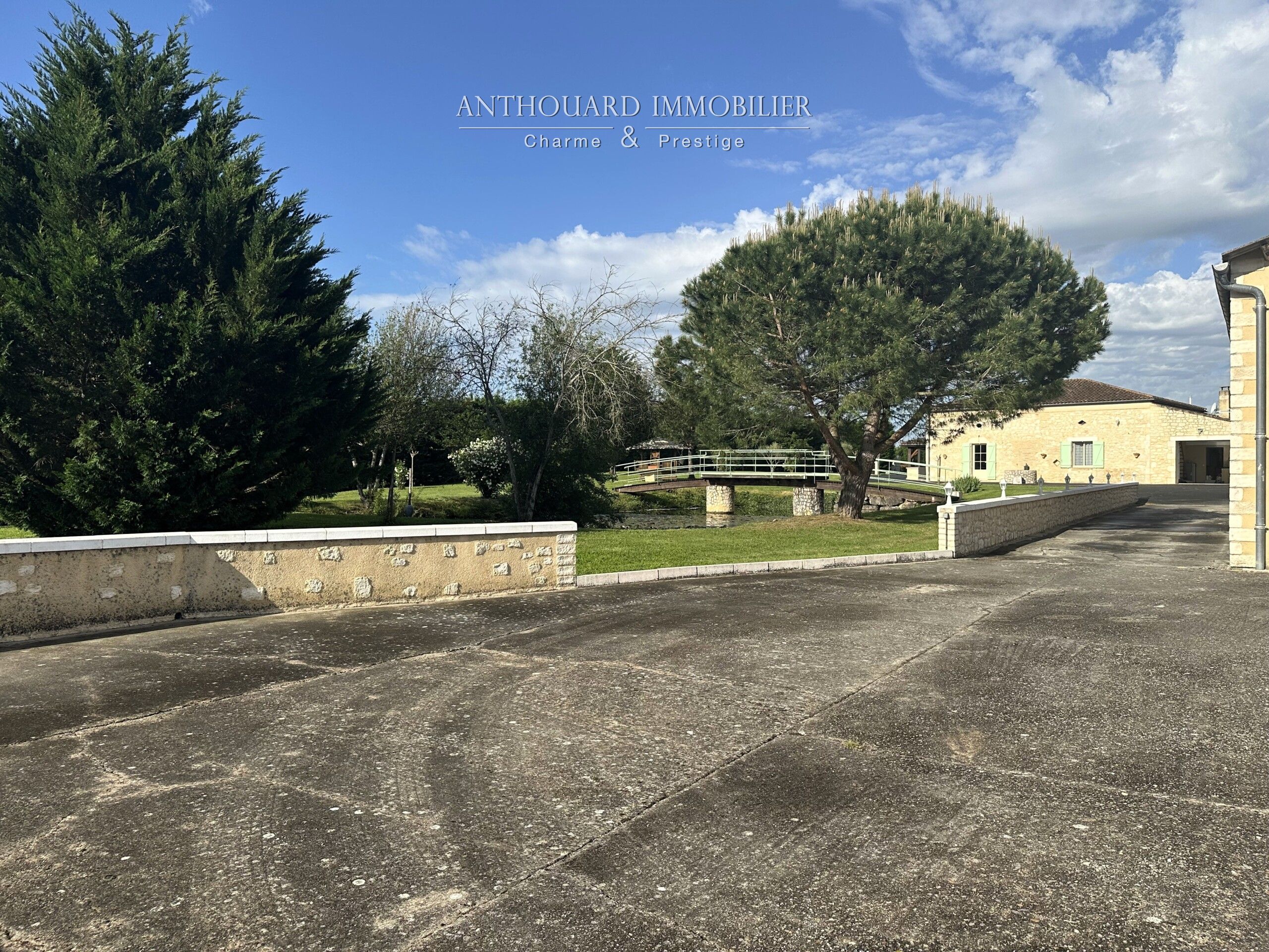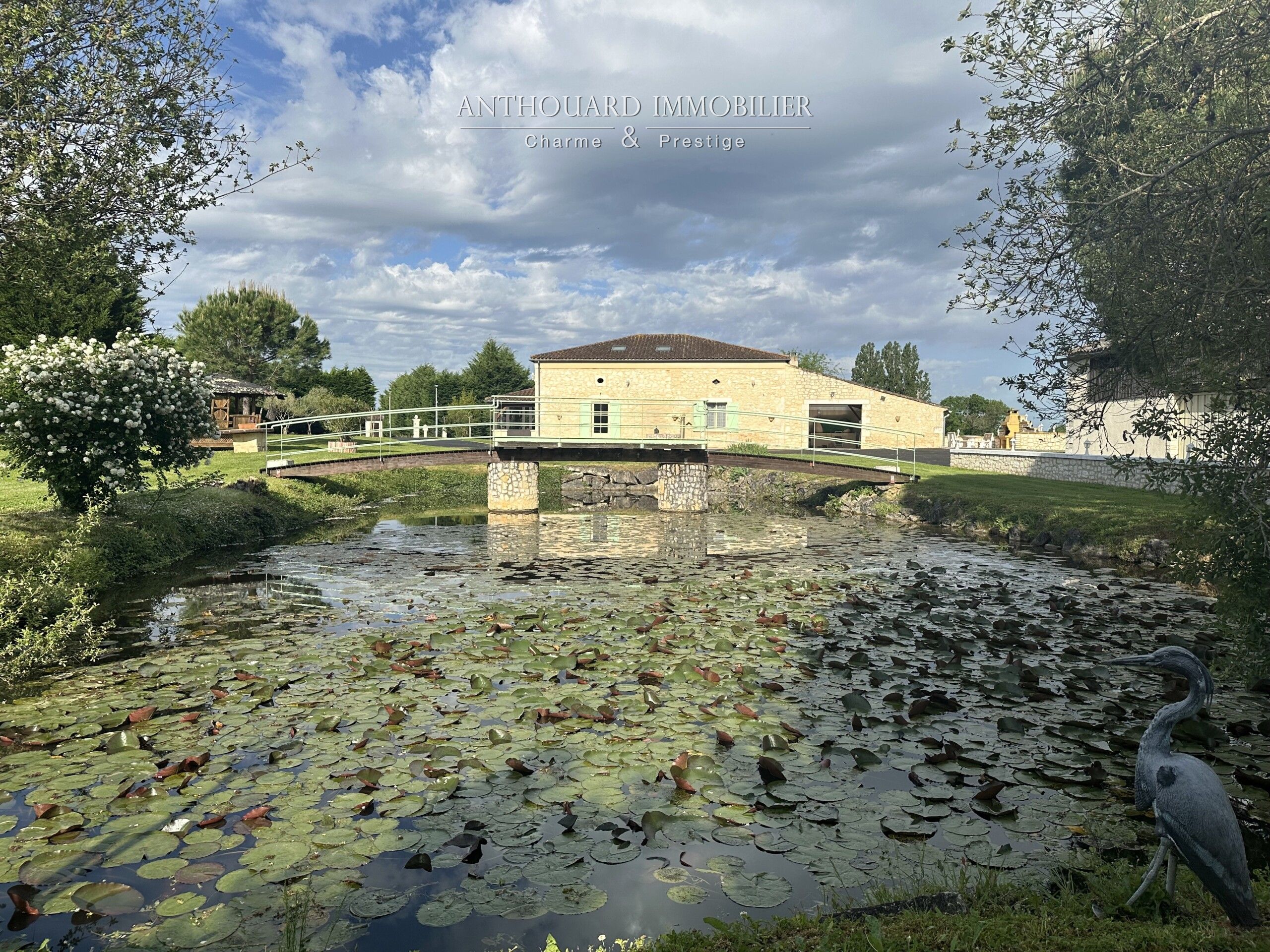 A landscaped pond of approx. 350 m², entrance to the property via an automatic gate, asphalt access and parking area.