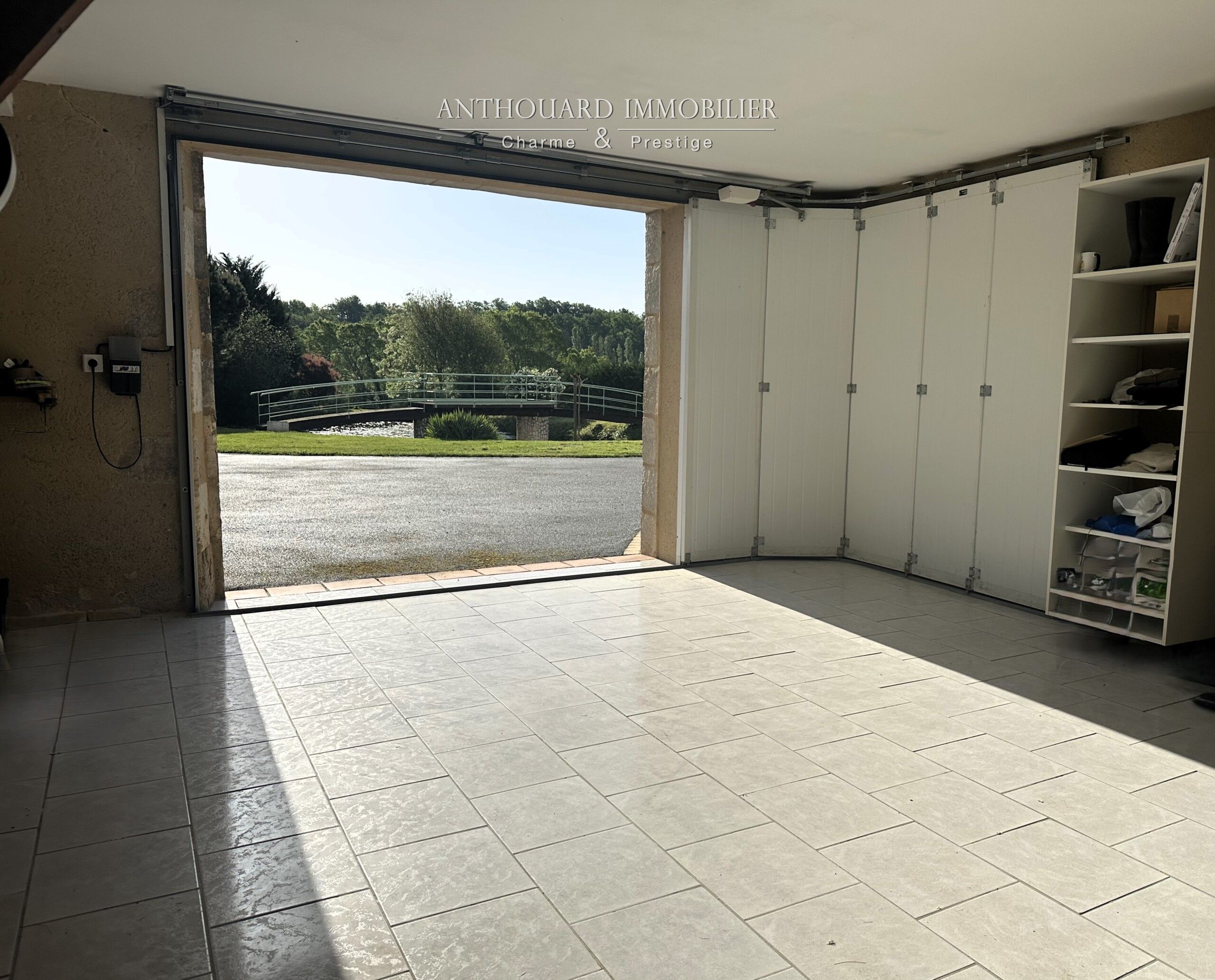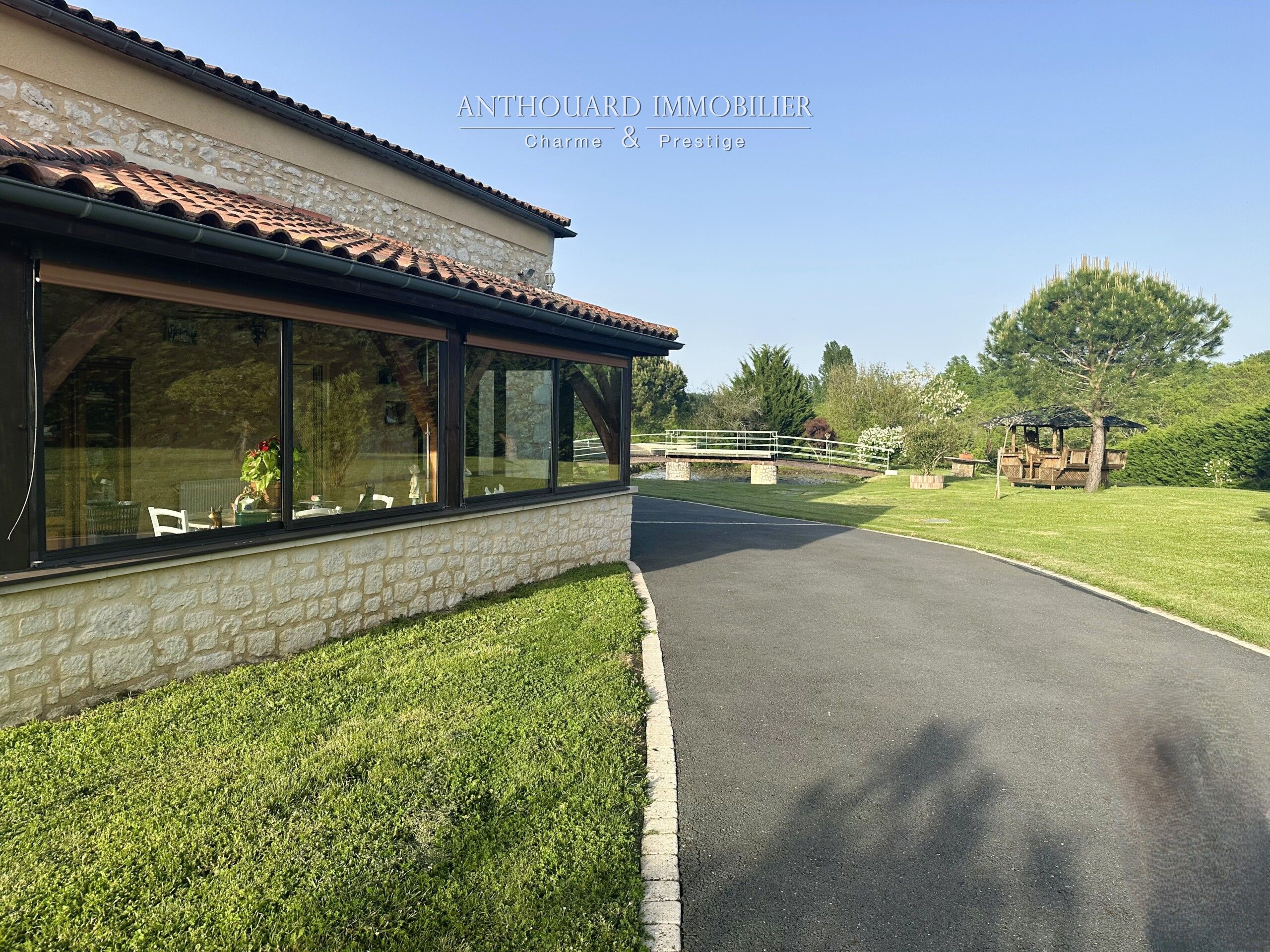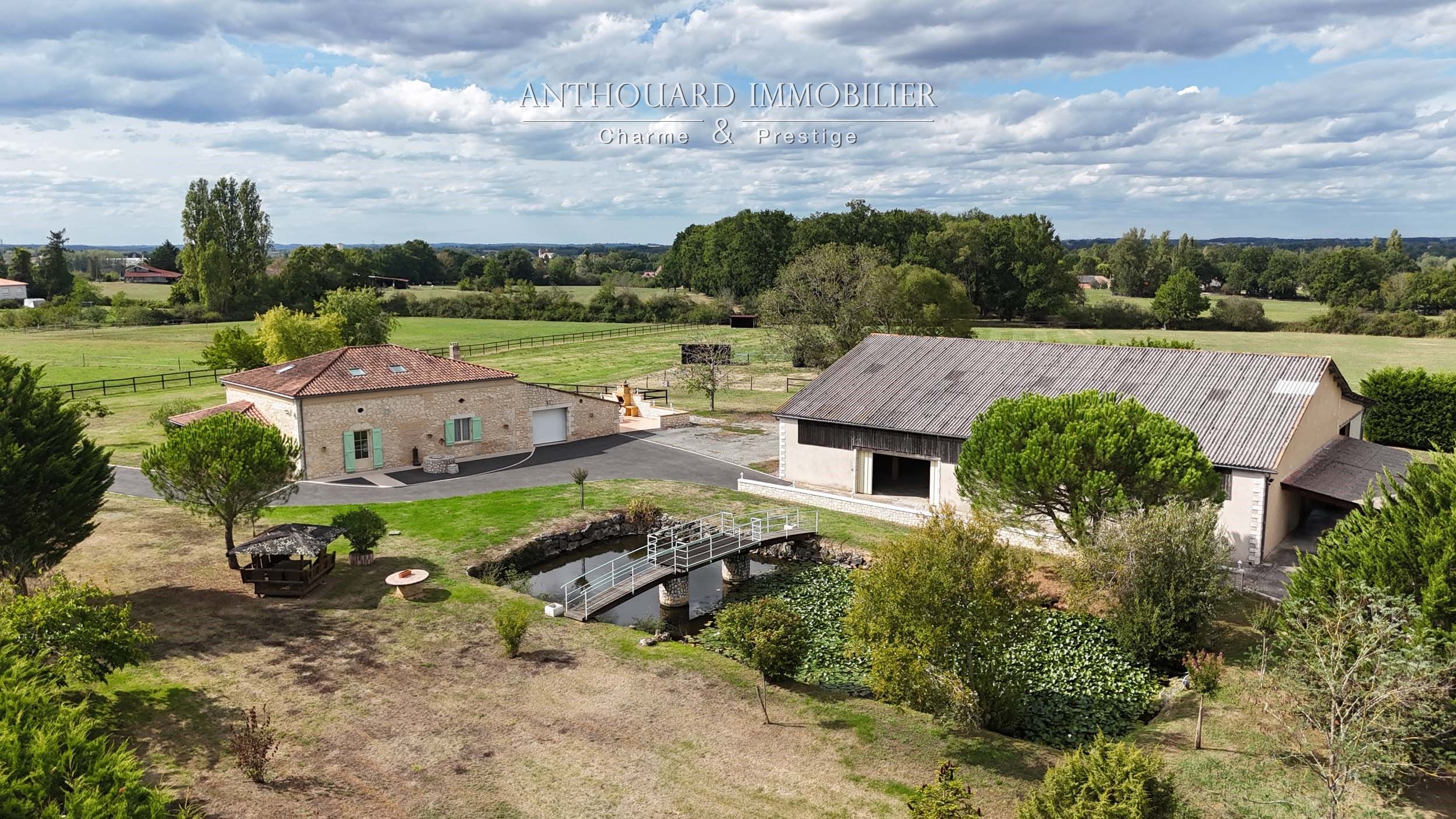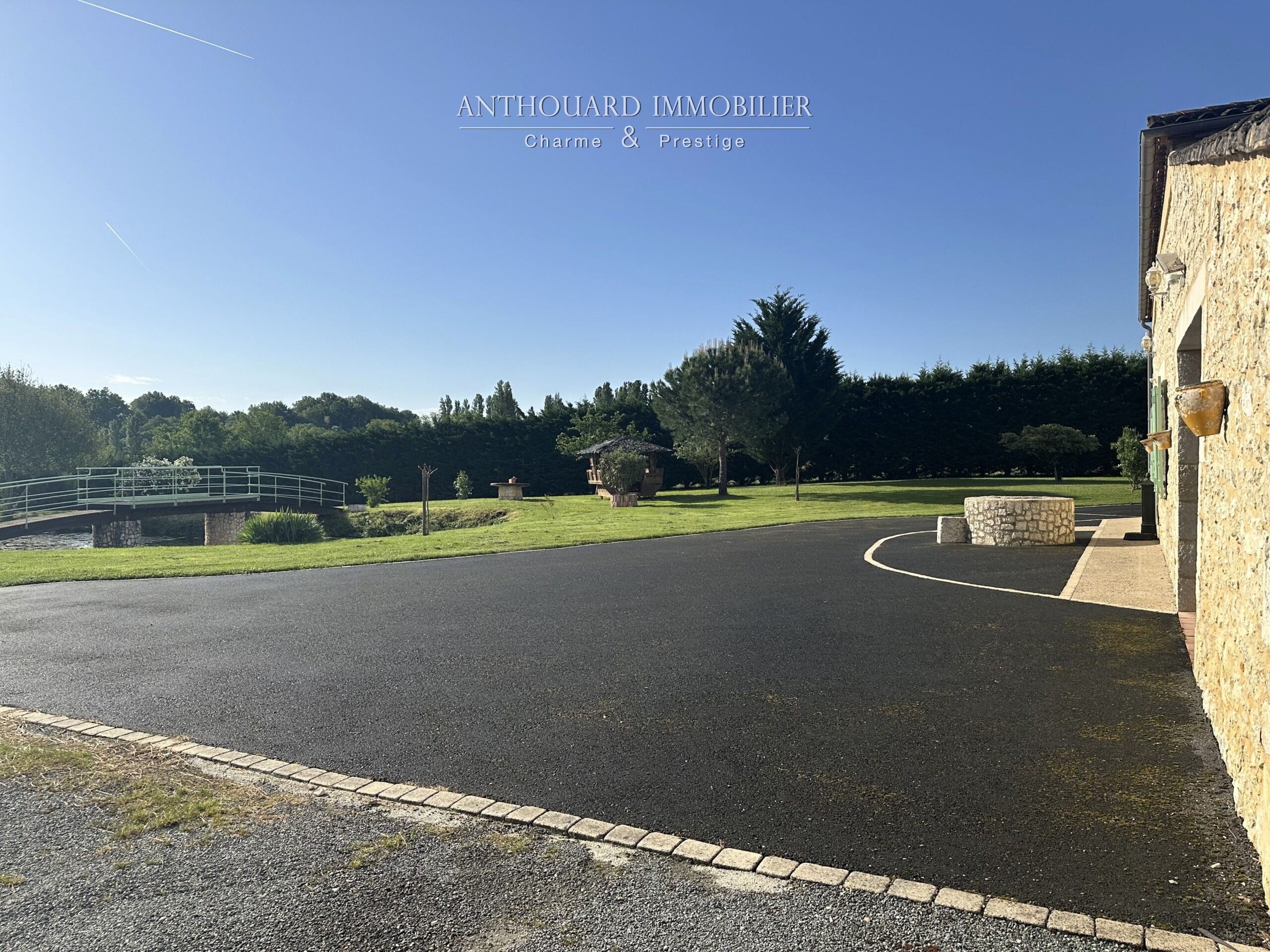 A landscaped pond of approx. 350 m², entrance to the property via an automatic gate, asphalt access and parking area.
