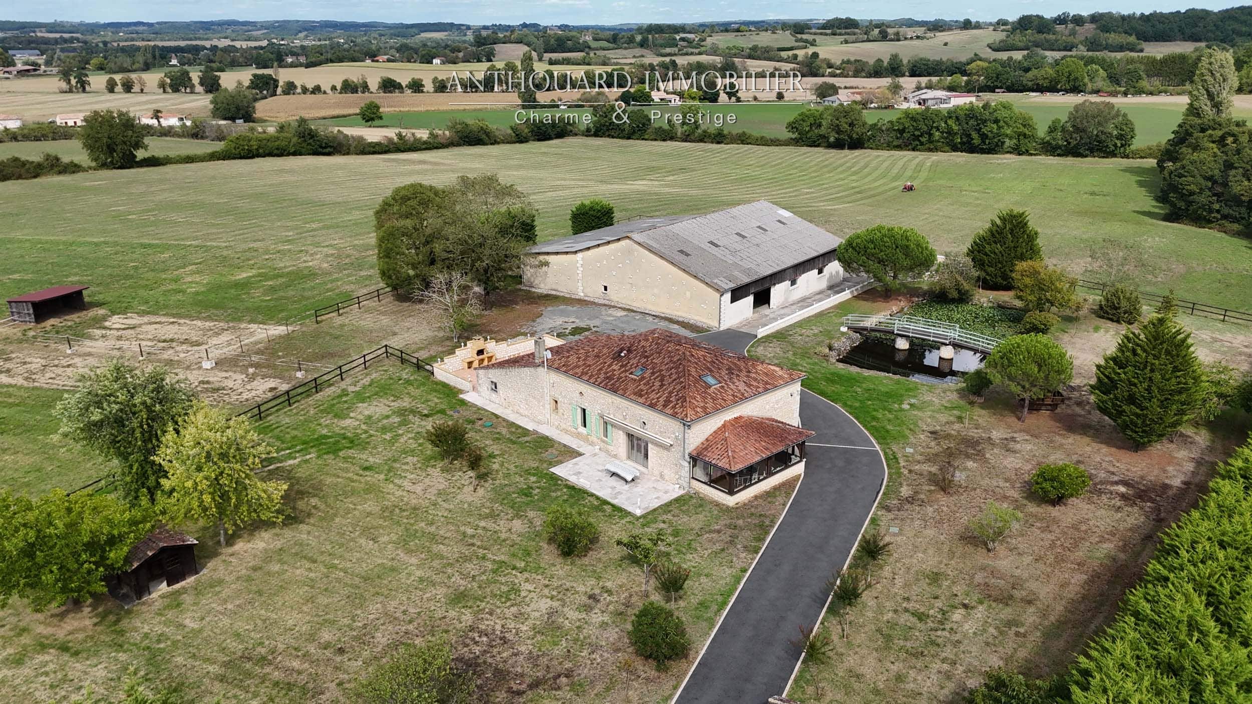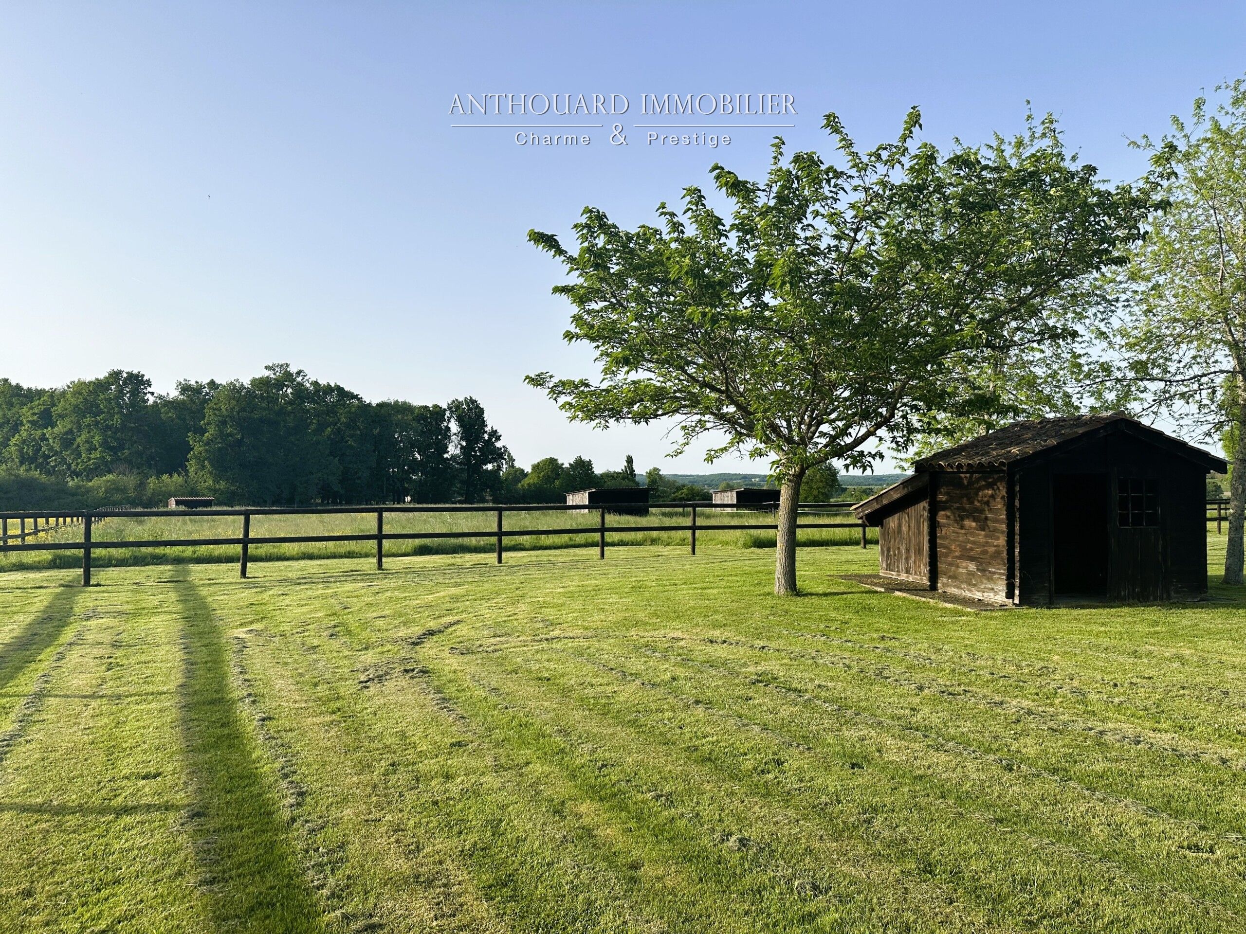 The barn has a floor surface area of 750 m² and is equipped with 4 horse stalls. The first is 3 x 4, followed by three larger ones measuring 3.8 x 4.5. All with automatic drinking troughs. A saddlery area. An enclosed, heated 42 m² room. Various access points for cars, lorries or tractors.