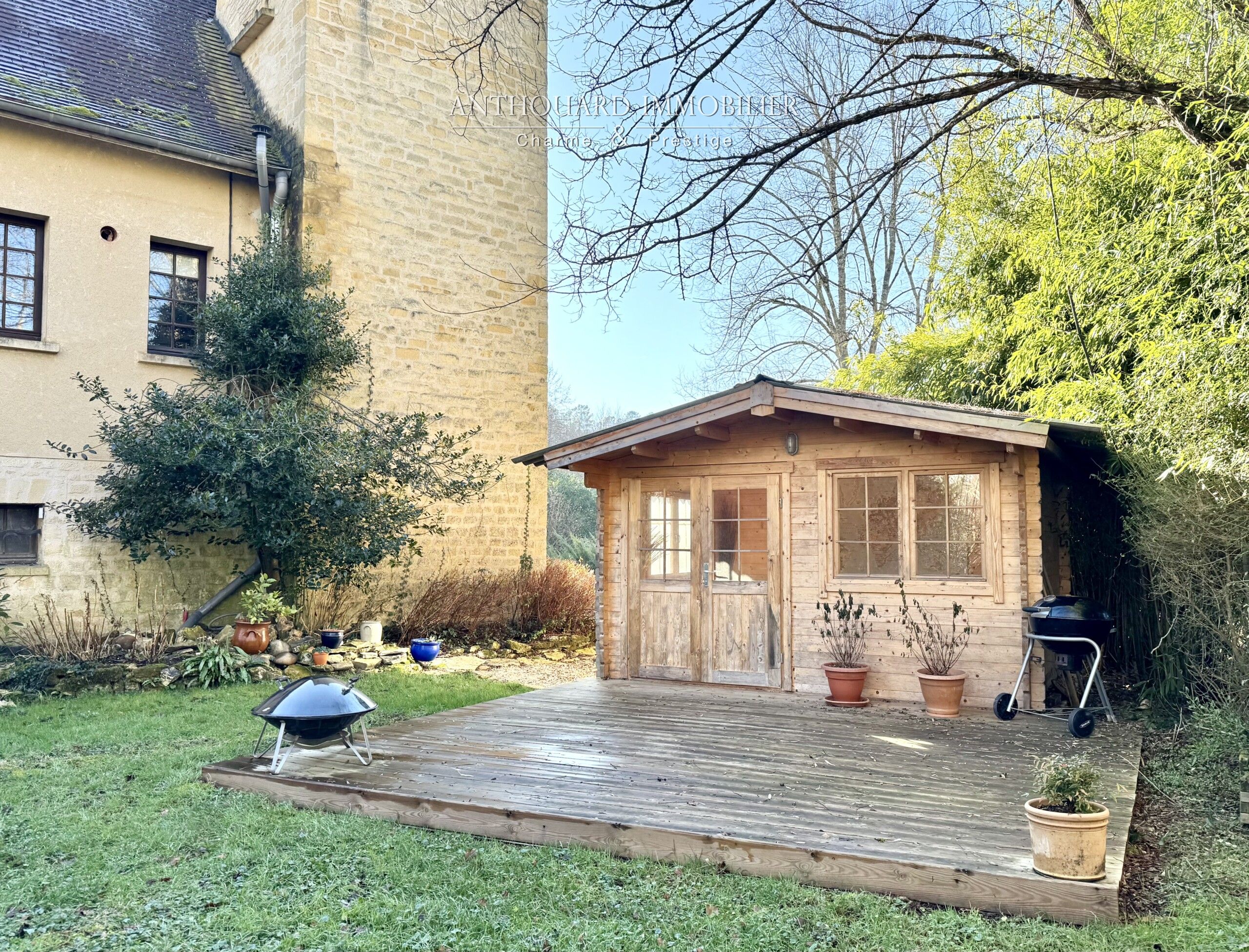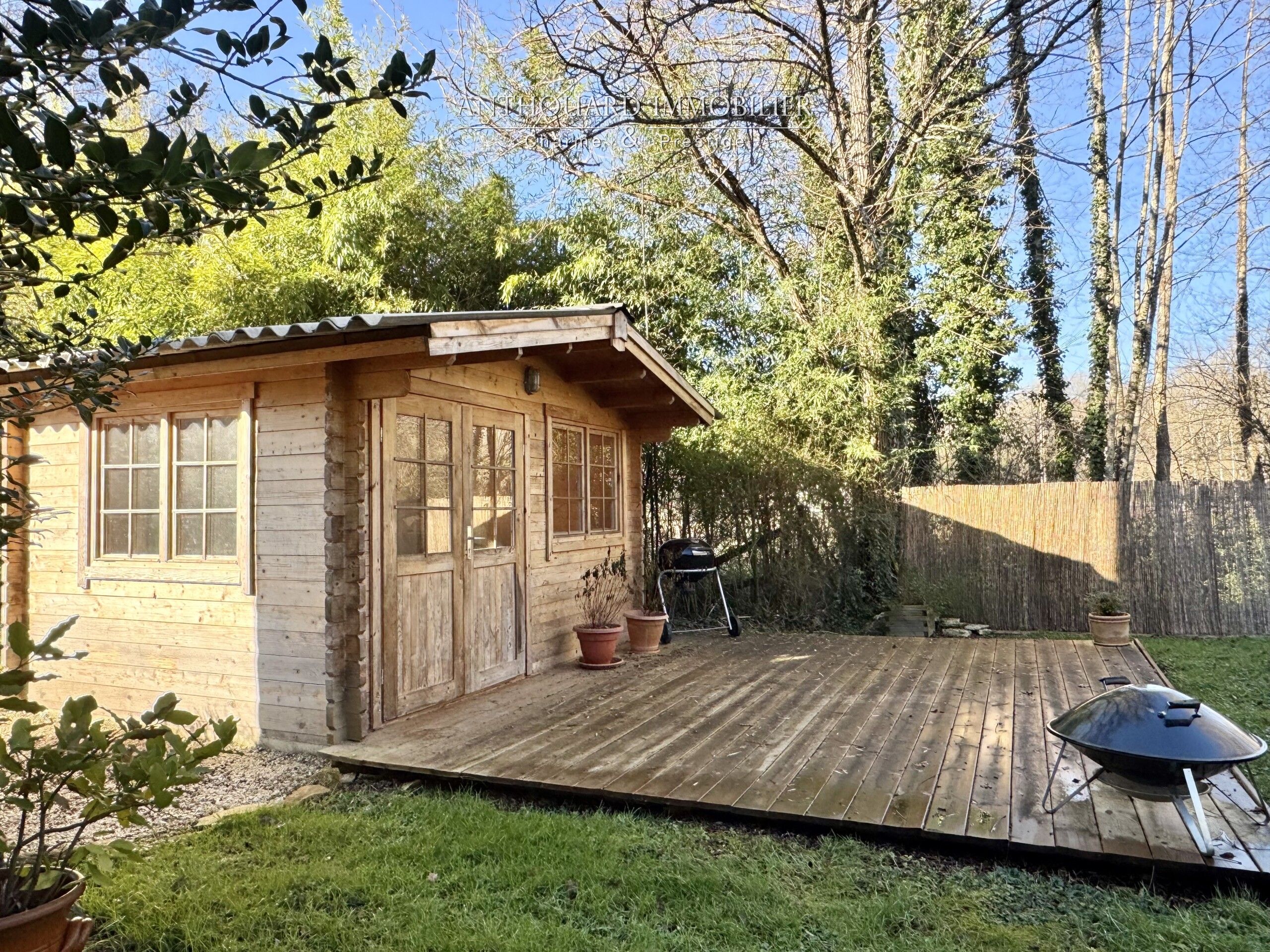Un cabanon de jardin avec terrasse en bordure de rivière donne beaucoup de charme à l’ensemble.