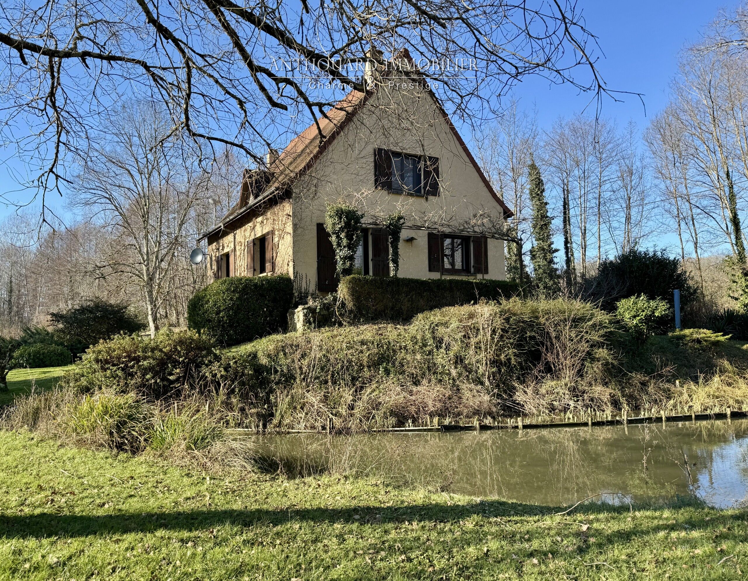 Sur un terrain plat avec étang, planté d’arbres matures.