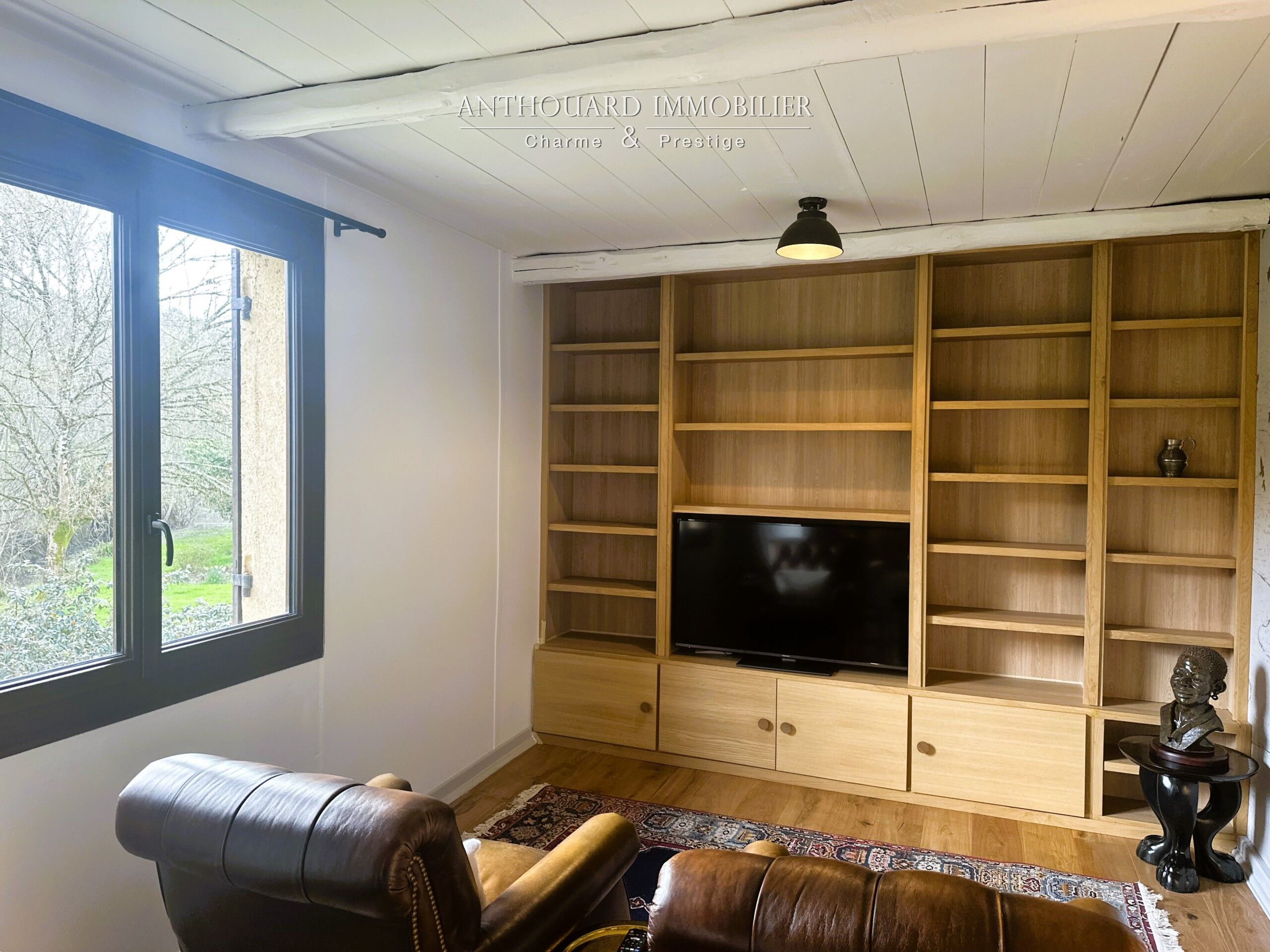 • Un espace salon TV avec bibliothèque sur mesure.