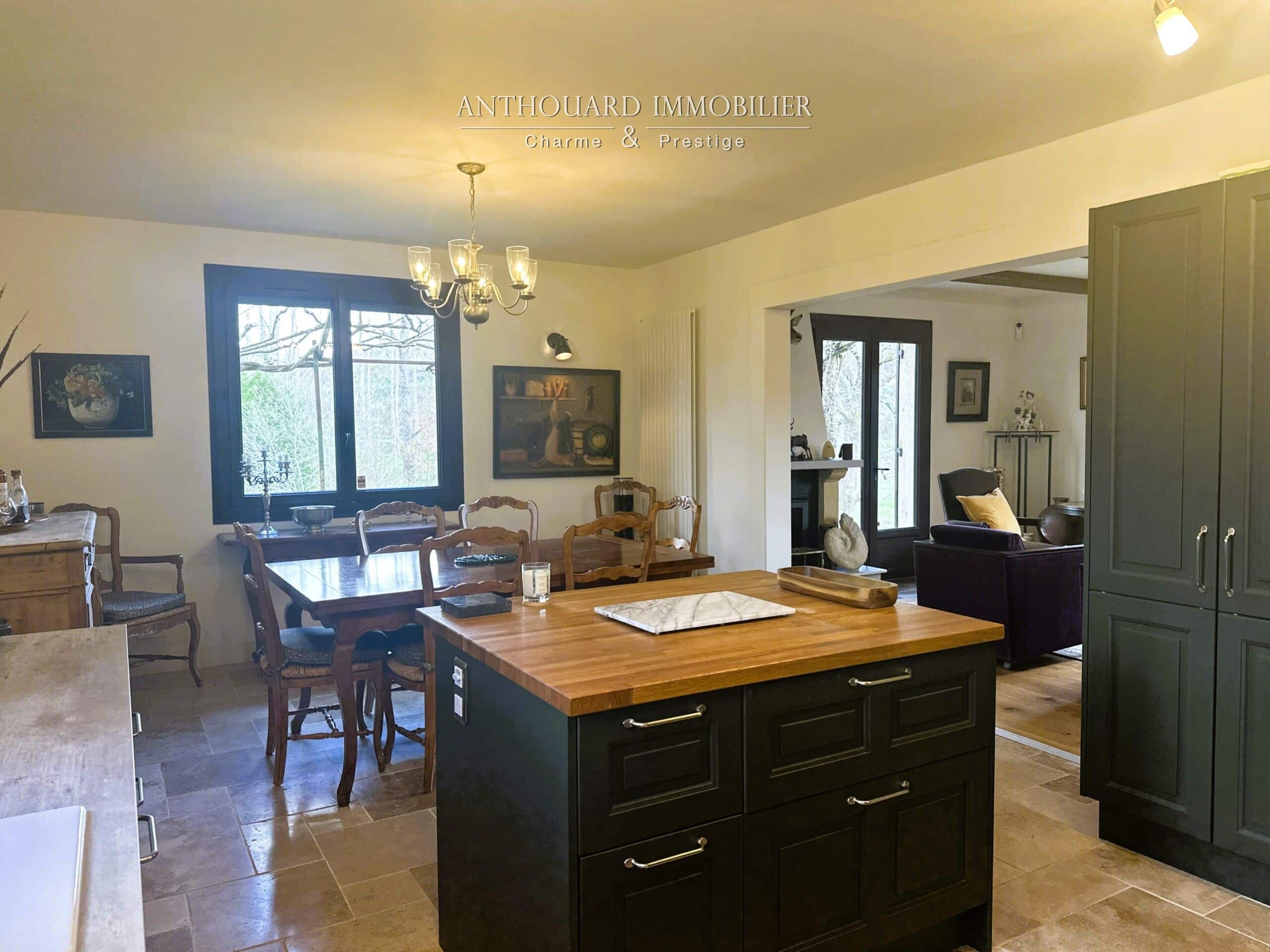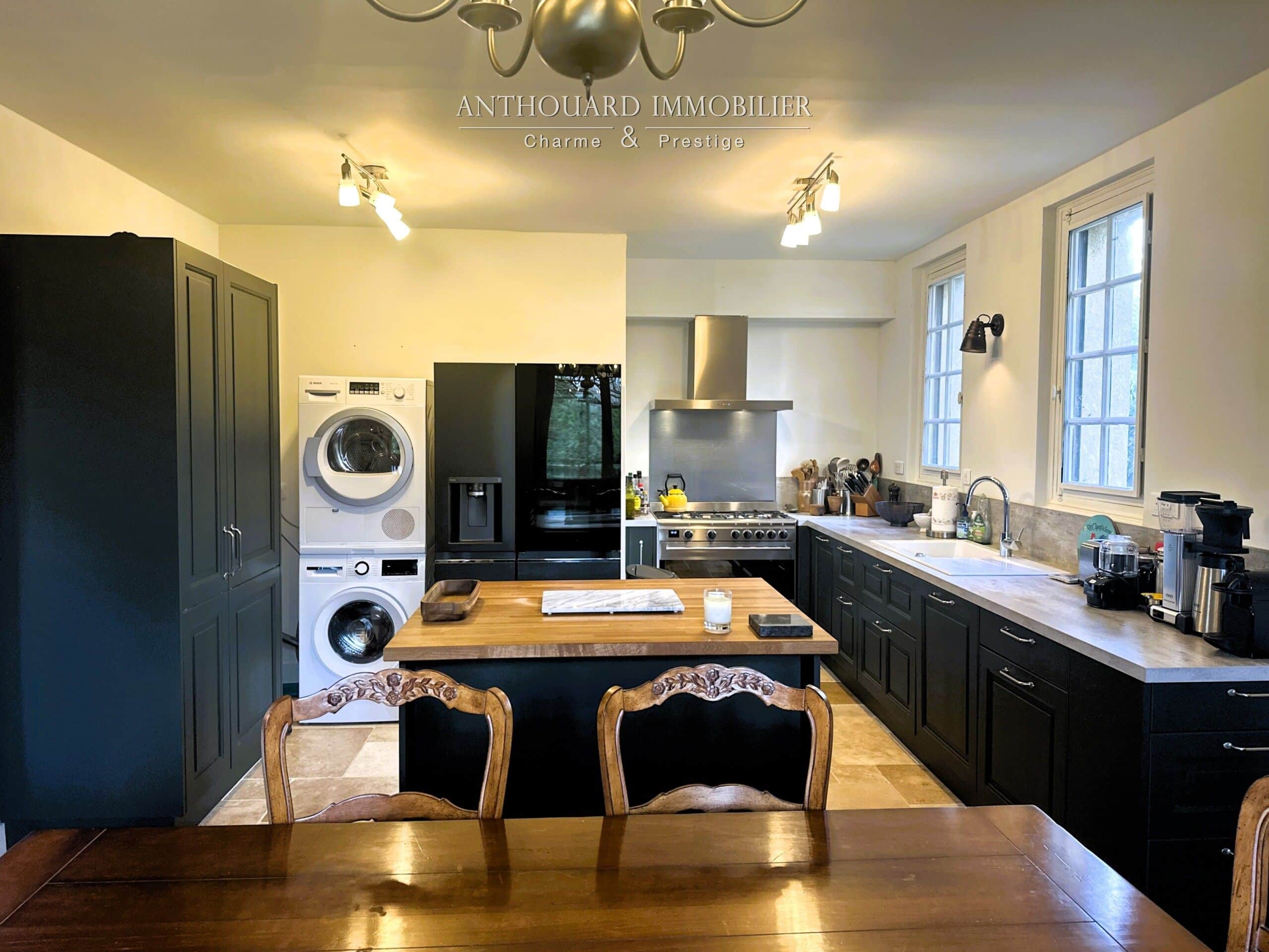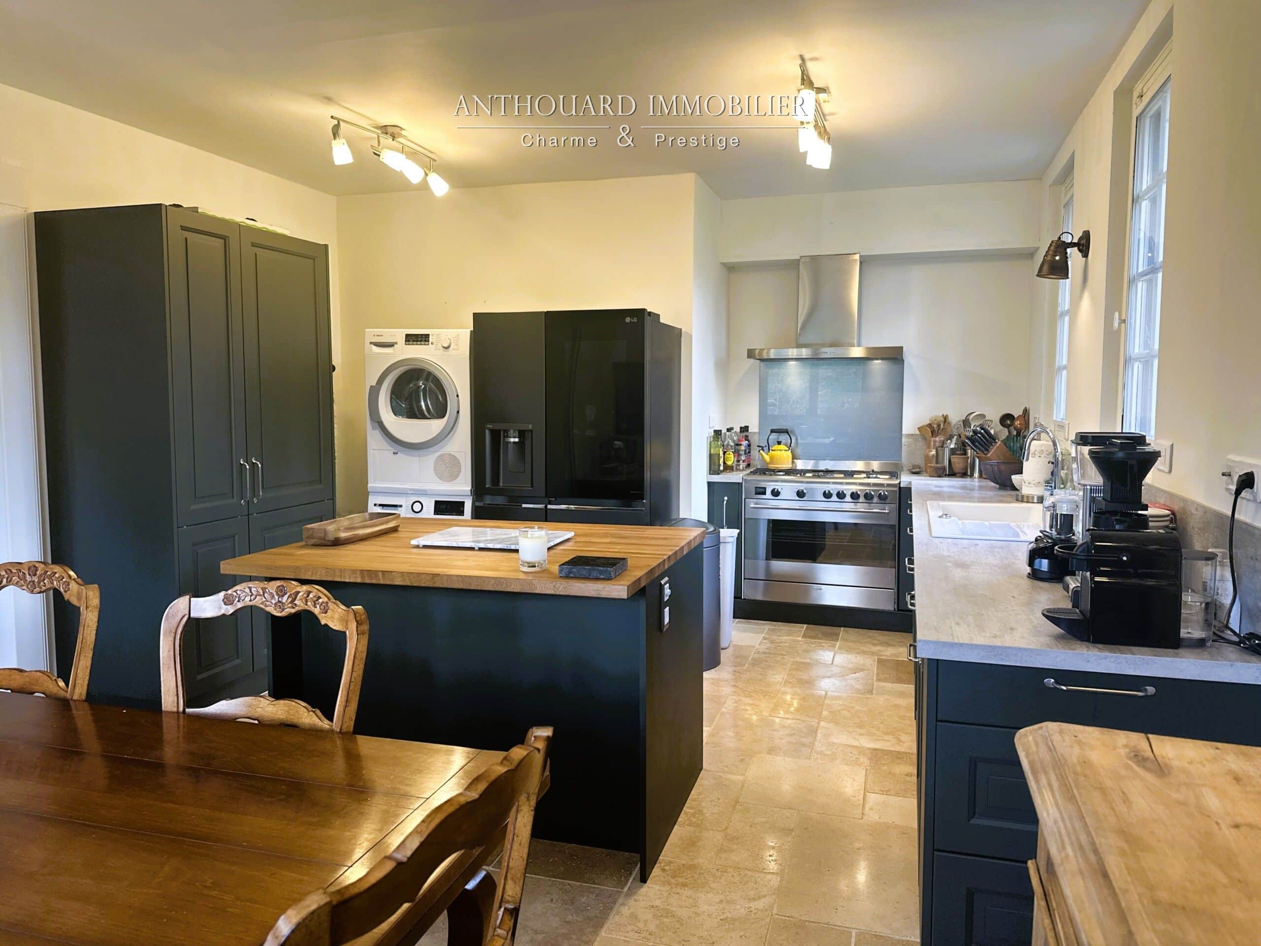 • Une cuisine équipée moderne bénéficiant de beaucoup de rangements, piano de cuisson au gaz 5 feux, large plan de travail et îlot central.