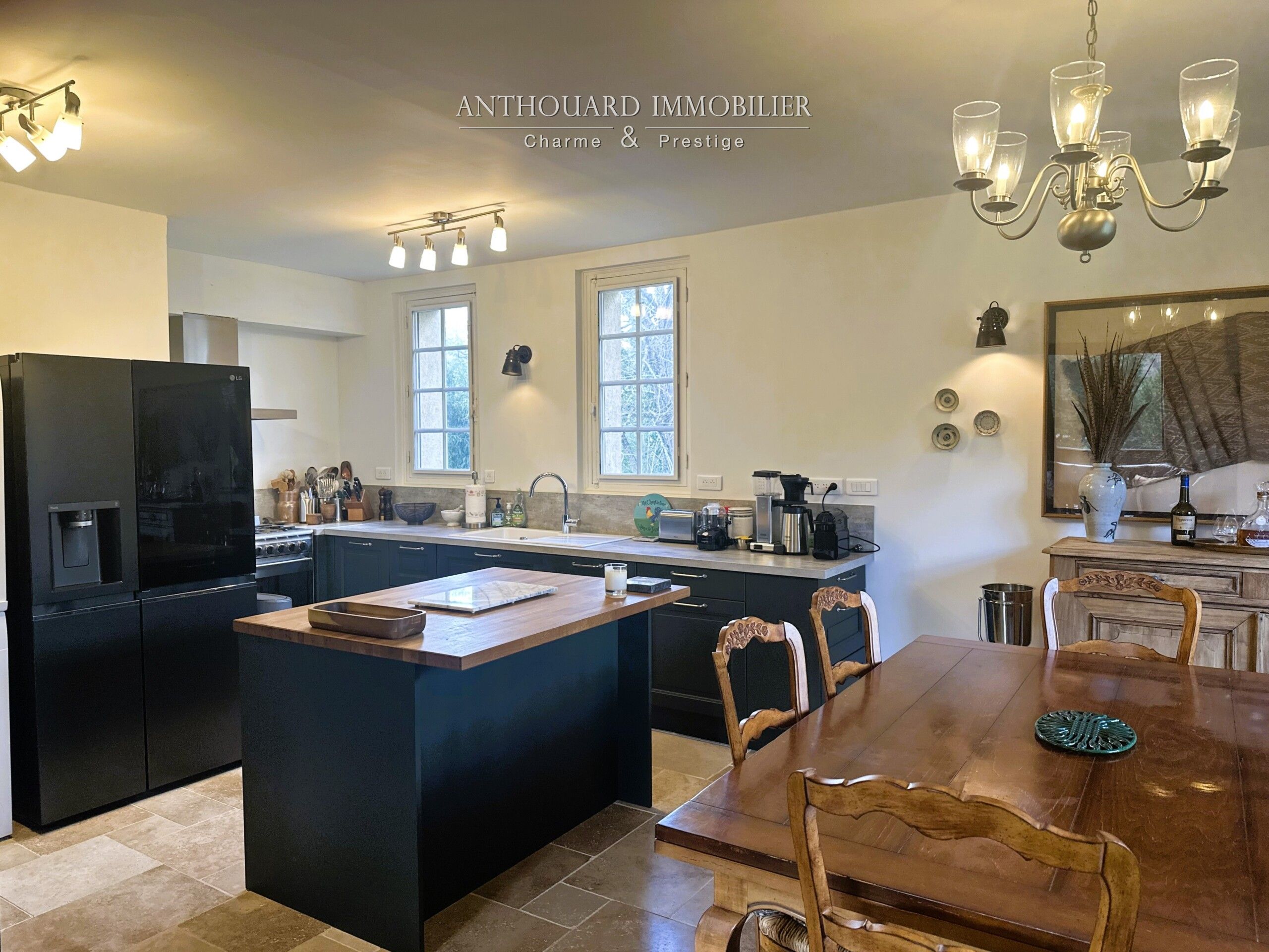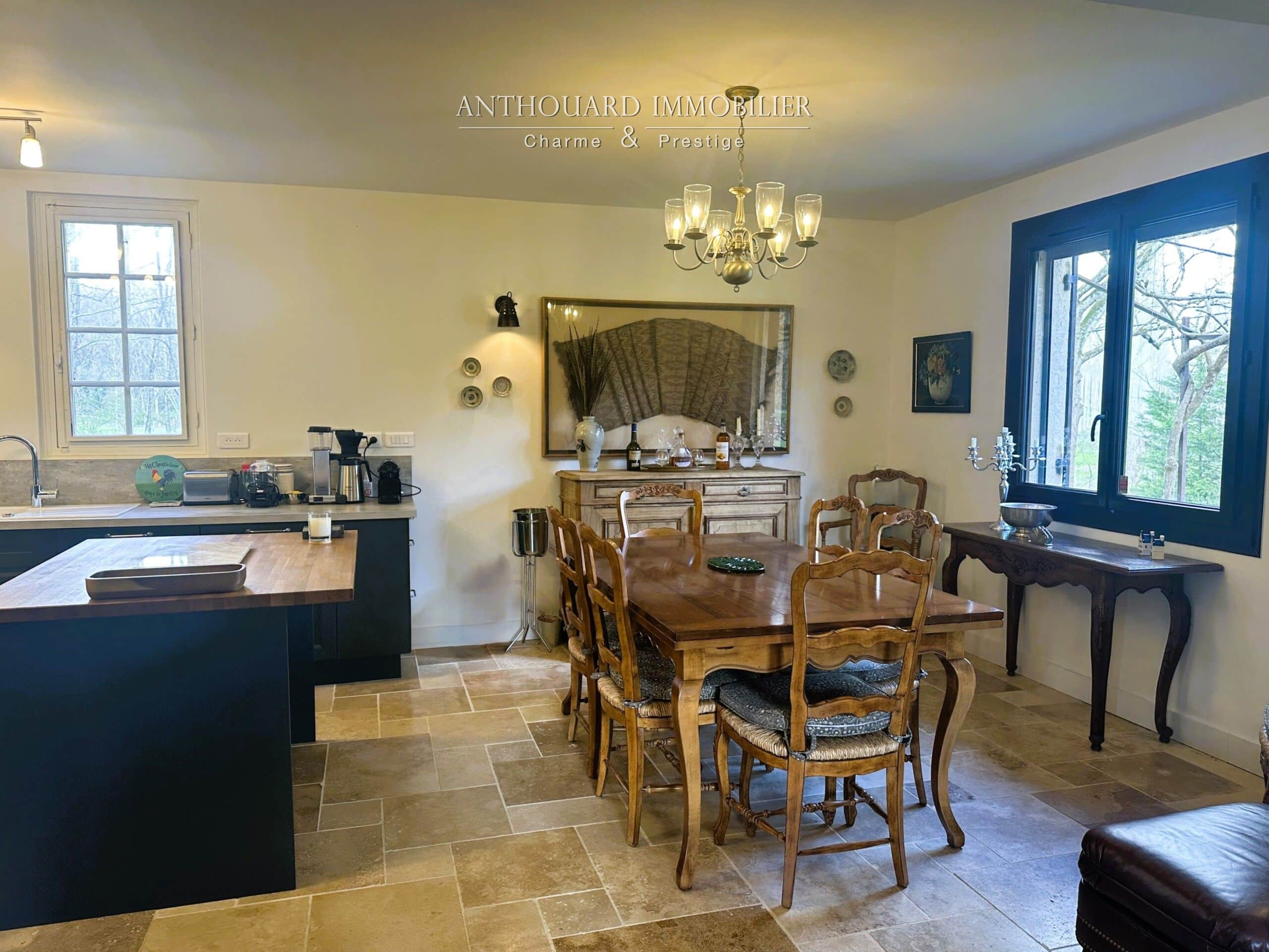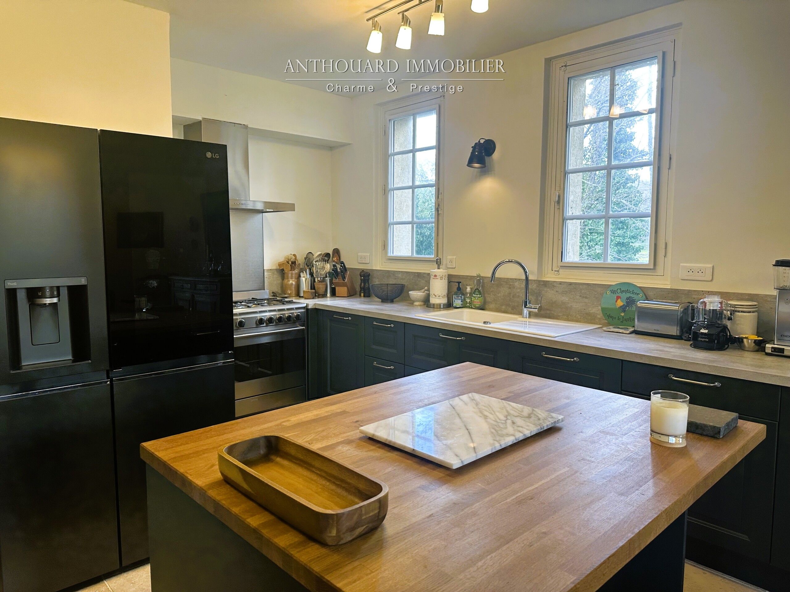 • Une cuisine équipée moderne bénéficiant de beaucoup de rangements, piano de cuisson au gaz 5 feux, large plan de travail et îlot central.