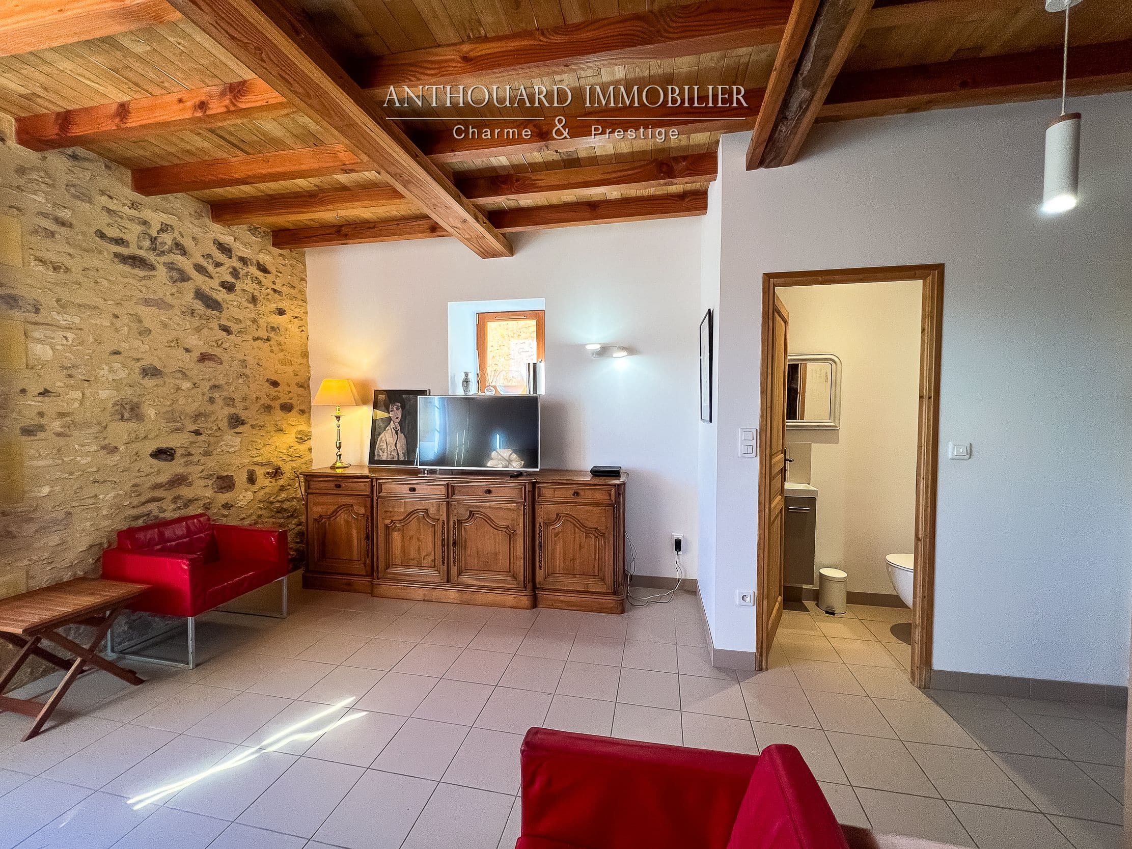 Grande pièce de vie avec cuisine équipée et coin salon, salle d’eau +WC.